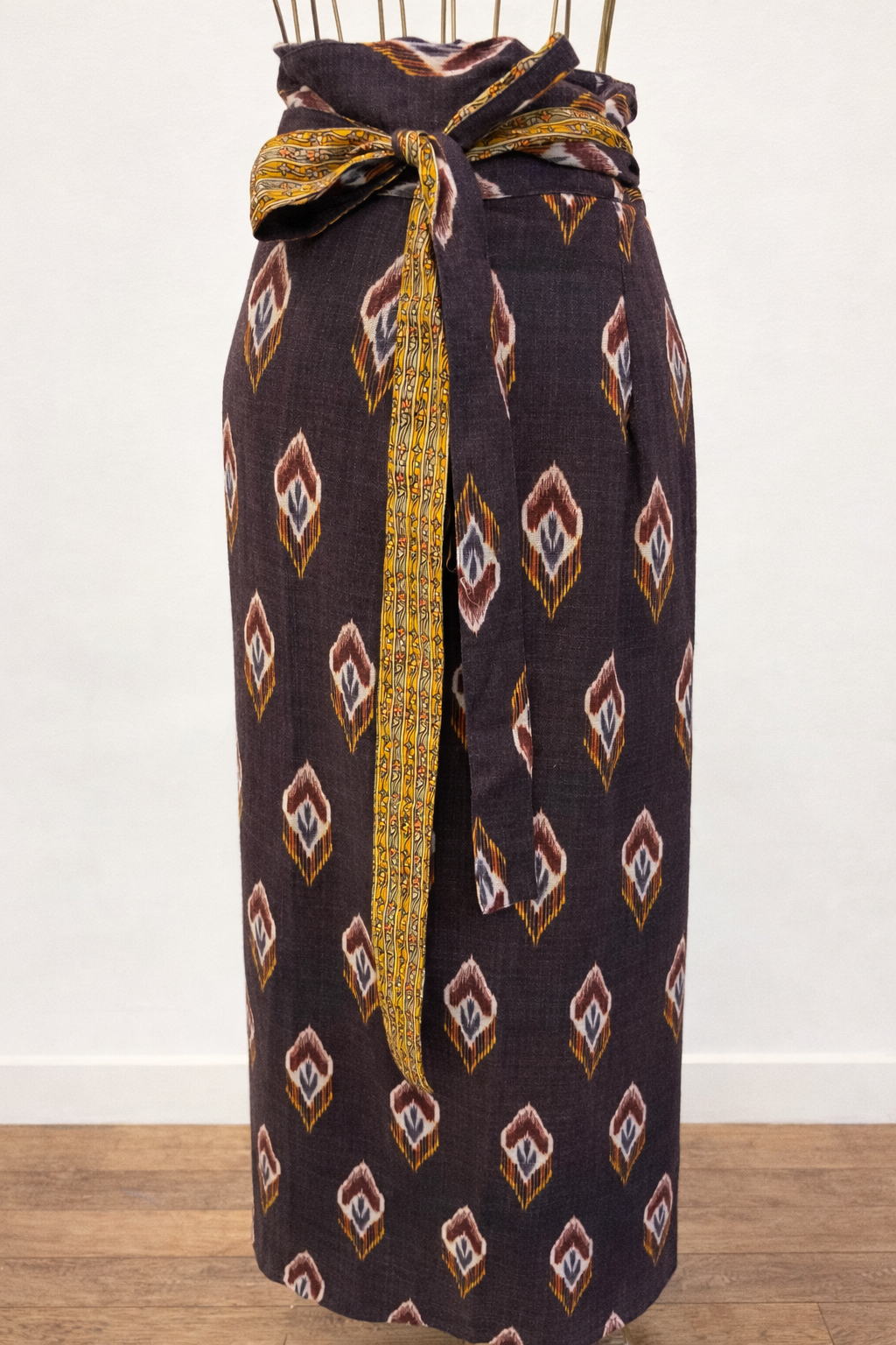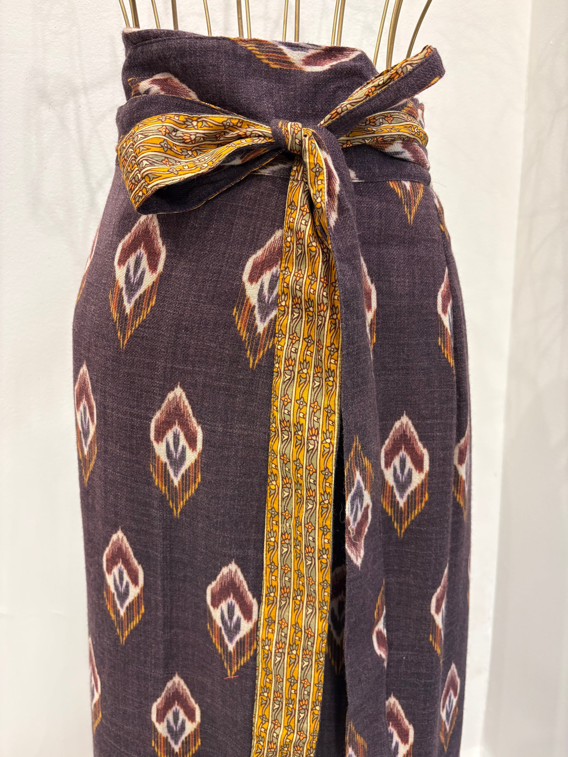Jupe en laine doublée de soie de saris recyclée et totalement reversible.
