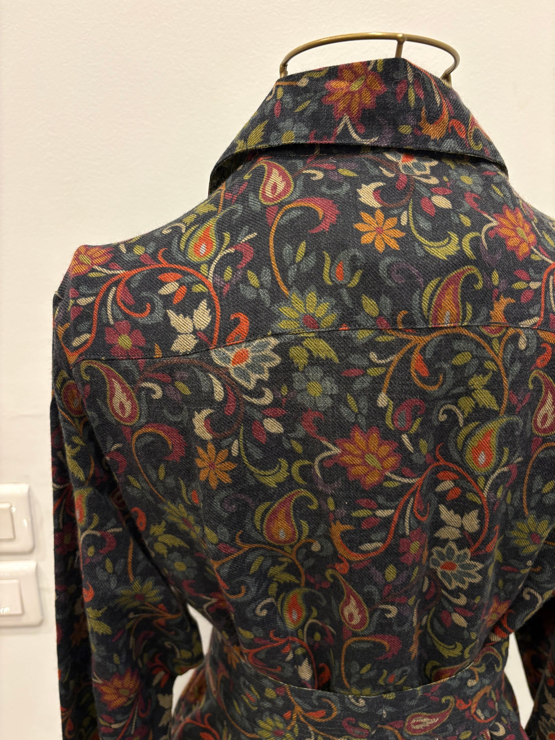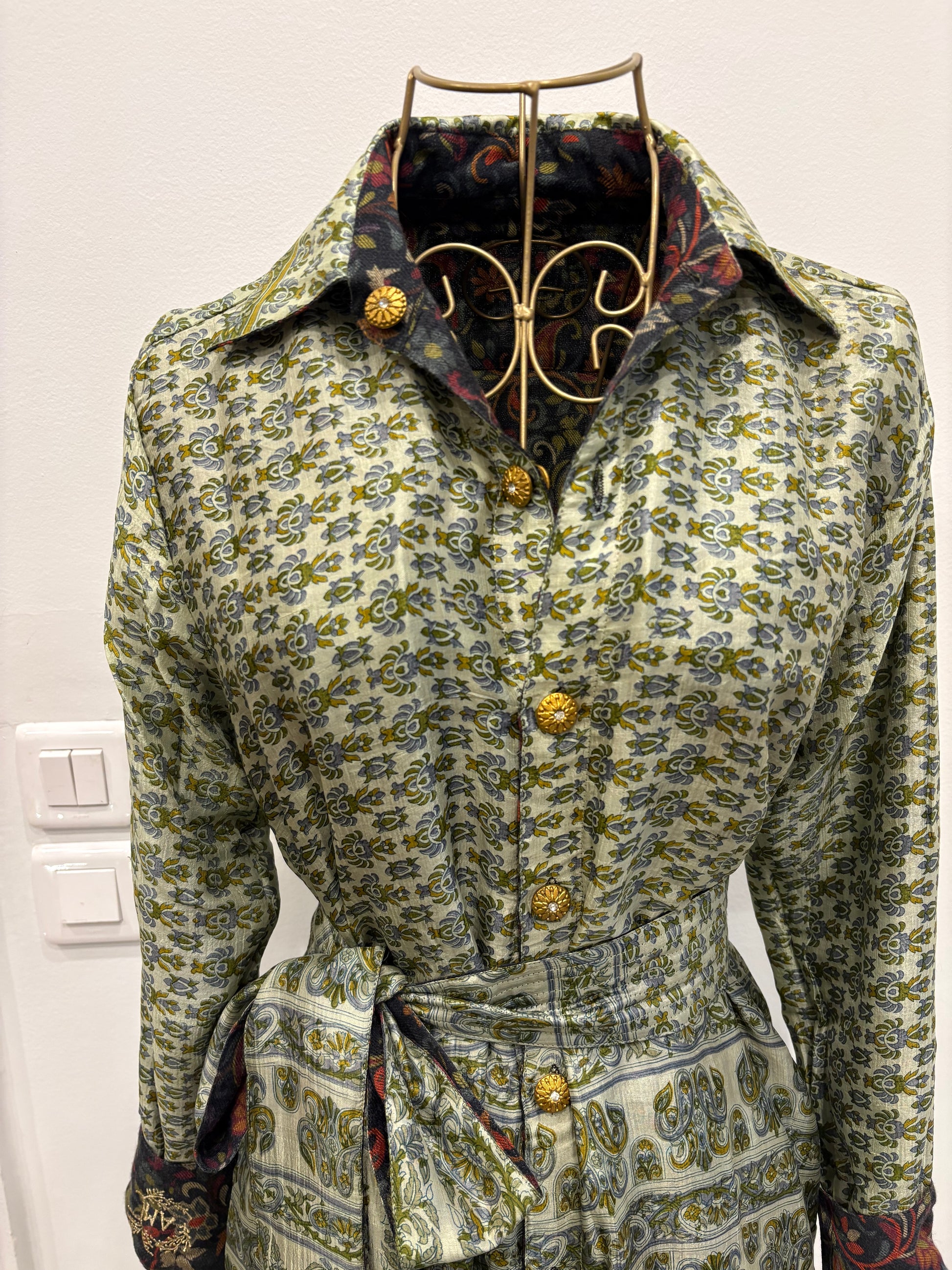 Robe longue chemisier réversible réalisée à partir de sari de soie ancien et de laine.