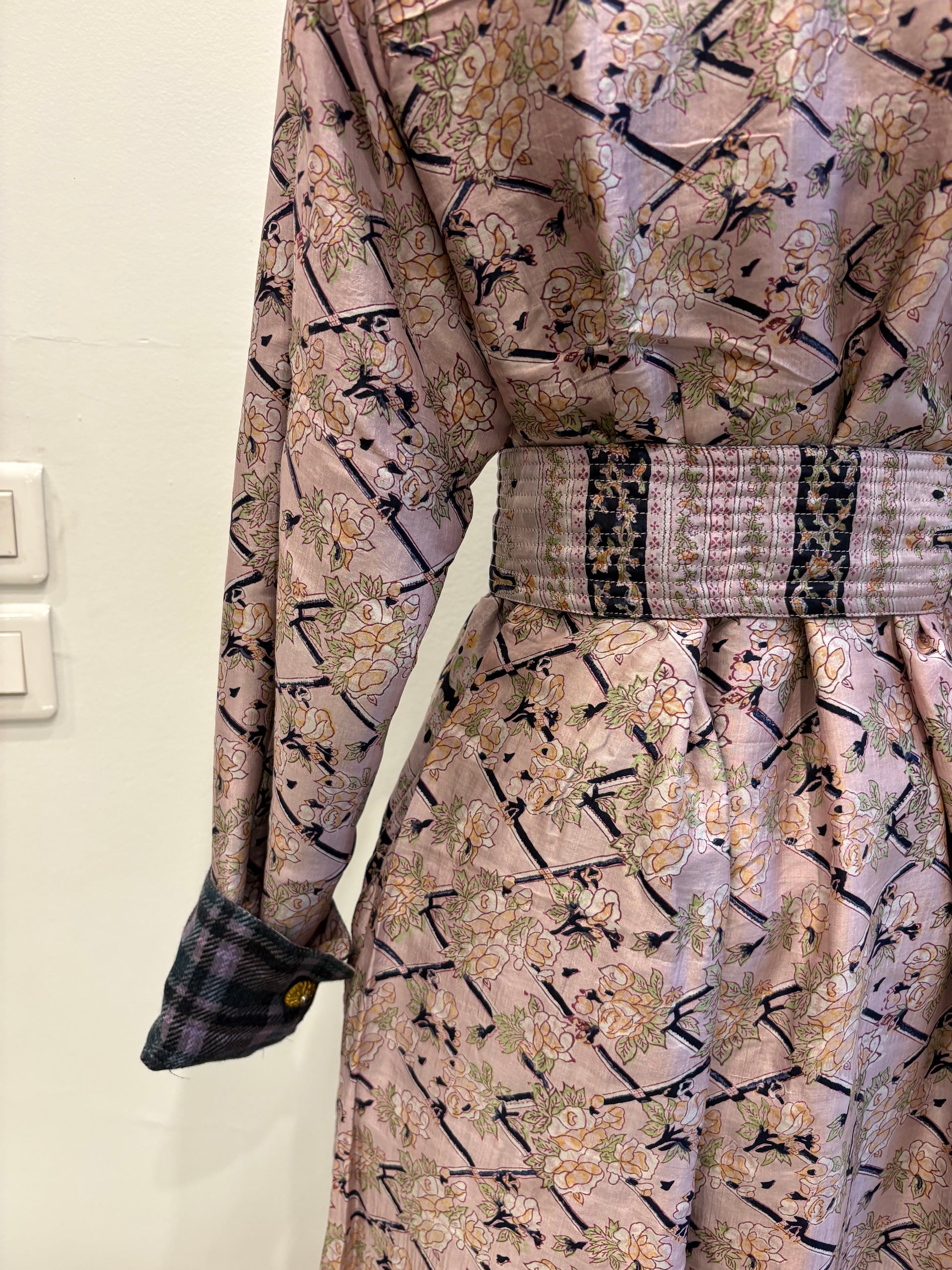 Robe longue chemisier réversible réalisée à partir de sari de soie ancien et de laine.